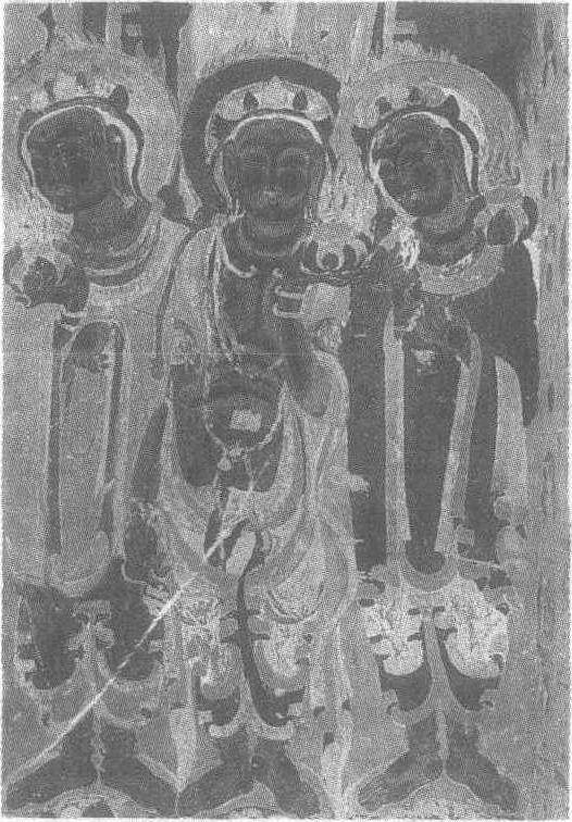 菩萨图壁画隋。纵150厘米,横90厘米。甘肃省敦煌县莫高窟第420窟西壁龛北侧壁画。这组菩萨共三身,皆呈站立状,体态丰满,面相甜美,表情含蓄。以黑色描绘肌肤,五官、双颊、双乳等高光处重色描绘。托摩尼宝珠和持念珠的手姿优美。背光、宝冠、项圈、手镯等装饰处均贴金,使画面增添了富丽的效果。