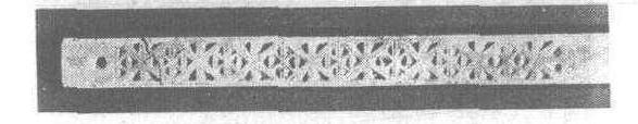 | 释义 | 菱形纹铜尺东汉。长23.46厘米,宽2.1厘米,厚0.3厘米。1971年於湖南省长沙子弹库1号东汉墓出土。湖南省博物馆藏。此尺用铜铸成,出土时断为二段,后修复,尺等分十寸,中间八寸镂空菱形纹图案,两端第一寸无纹饰,有一端有一穿孔。