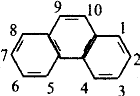 菲的结构与蒽相似,分子中所有原子在同一平面上,是一个闭合的共轭体系,具有芳香性。分子中有5个对应的位置——1与8; 2与7; 3与6; 4与5;9与10。其中9与10位活性较高,取代、氧化、加成反应首先在9与10位进行: