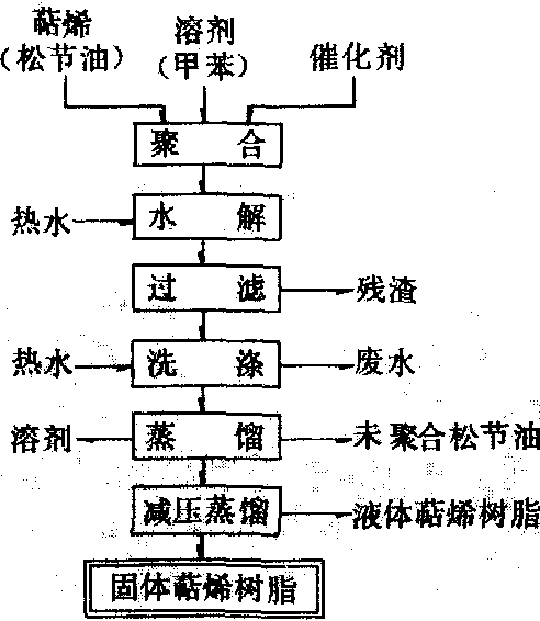 萜烯树脂制造工艺流程示意图 性质与用途 萜烯树脂可为粘稠状液体直至脆性固体。淡黄色,无毒无臭,不溶于水、甲醇、乙醇、丙酮和乙酸乙脂。溶于非极性溶剂和植物油。具有优良的抗湿性、抗蒸汽透射性、柔韧性和粘合性。粘接力强,内聚力高,耐热,耐光,耐稀酸,耐碱,抗老化性能好。在胶粘剂应用方面,不同种类不同规格的萜烯树脂具有不同的胶粘特性,因此具有不同的用途。萜烯树脂在胶粘剂中都作为增粘剂使用。❶β-蒎烯树脂颜色浅淡,保色性好,具有优良的粘合性,作天然橡胶和聚异戊二烯的粘合剂,溶剂型压敏胶带,制作标签以及罐头端面密封。 ❷双戊烯树脂热稳定性、抗氧性、热粘合性好。用于热熔胶粘剂和涂料生产。 ❸α-蒎烯树脂颜色稳定性好。用于热熔压敏胶和溶剂型胶粘剂系统,是苯乙烯—丁二烯橡胶(SBR)和苯乙烯—丁二烯—苯乙烯(SBS)共聚物的优良粘合剂。 ❹萜烯酚树脂是苯乙烯—丁二烯橡胶、天然橡胶和异戊间二烯橡胶、氯丁橡胶、乙烯—醋酸乙烯酯共聚物的优良粘结剂。在制造热熔胶粘剂和涂料时,用萜烯酚树脂可以增加产品的延展性和柔韧性。 质量 数均分子量(Mn)是重要质量指标之一。商品萜烯树脂的数均分子量见表。 萜烯树脂的数均分子量(Mn)