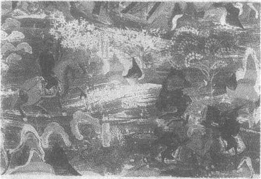 | 释义 | 萨埵本生图(局部)壁画隋,甘肃省敦煌县莫高窟第419窟窟顶东披壁画。此为萨埵本生图的开始部分,三位太子入山狩猎。画面上山石危耸,绿树成荫,太子骑于马上,矫健而潇洒。三位太子各具姿态,或伏于马背,或回首了望,或拉弓待发,皆十分生动。在他们的视野内的几只小鹿拚命狂奔,四肢几乎成直线,展现出小鹿以最高速度的奔跑状。而山的另一边的一只野兽昂首翘尾静立,显示出它正处于安全的境地。此图的景色以粗笔挥洒,具有粗犷、奔放之感。人物、马匹、动物的刻画则线条流畅,设色精美。
