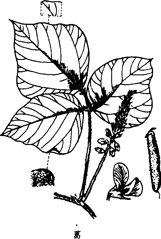 葛 葛根地名,新疆回族聚居区之一。今新疆奇台县境。有葛根、老中葛根、西葛根,相距不远。清光绪初年,宁夏半个城(今同心县)和青海西宁等地的部分回民迁徙于此,从事开垦。后来一部分农民又被迁至吉木萨尔谭家戈壁、五家湾等处开荒种地。 葛根特产中药材。分布于湖南省各地。豆科植物野葛的干燥根。秋、冬二季采挖,野葛多趁鲜切成厚片或小块; 干燥; 甘葛藤习称为“粉葛”,多除去外皮,用硫磺熏后,稍干,截段或再纵切两瓣,干燥。野葛性状: 呈纵切的长方形厚片或小方块,长5~35cm,厚0.5~1cm。外皮淡棕色,有纵皱纹,粗糙。切面黄白色,纹理不明显。质韧,纤维性强。无臭,味微甜。粉葛性状: 呈圆柱形、纺锤形或半圆柱形,长12~15cm,直径4~8cm; 有的为纵切或斜切的厚片,大小不一。表面黄白色或淡棕色,未去外皮的呈灰棕色。横切面可见由纤维形成的浅棕色同心环状,纵切面可见由纤维形成的数条纵纹。体重,质硬,富粉性。其功能为解肌退热、生津、透疹、升阳止泻。葛根具有清热解毒、消脂养颜、抗瘤防癌以及改善人体心脑血管和微循环等多种保健作用,被誉为“江南人参”,葛根综合开发具有广泛的市场前景。近年,汪卫东在桃江扶贫建成湖南最大的葛根种植基地。 |