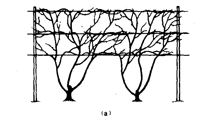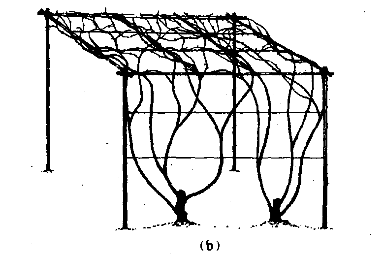 (b)棚架 葡 萄 架 整形和修剪 在埋土防寒地区主要采用扇形和龙干形。❶扇形的枝蔓呈扇面分布在架上, 有3~5个主蔓(单篱架), 每一主蔓上留2~4个或更多的结果母枝和2~3个预备枝。生产上常见的无主干多主蔓自然扇形, 不如多主蔓规则扇形能更有效地控制葡萄的顶端优势和避免主蔓很快光秃, 也有调节负载量的相当灵活性。规则扇形的结果枝组由长4~10节的结果母枝和长2~3节的预备枝组成。 ❷龙干形是中国河北、辽宁等省一些产区常用的一种棚架株形。植株具有1~2个主蔓, 由地面倾斜向上达于棚面,龙干长约4~10米或更长,在龙干上均匀分布许多结果单位, 类似“龙爪”,其上的枝条多行短梢修剪, 仅先端的1年生枝剪留较长。龙干形的龙眼葡萄在水浇地上每公顷产量可达30~37.5吨左右。 冬季修剪时期一般在埋土防寒之前。在不埋土区从葡萄落叶之后至上冻前都可进行。修剪时要注意保留优良的结果母枝, 及时更新枝蔓, 以防秃裸。 生长期植株管理 埋土防寒区春季萌芽前出土上架。萌芽时进行以下工作: ❶抹芽除梢。保留合理的新梢和花序数。 ❷结果枝摘心。对易落花落果的品种如玫瑰香、巨峰等, 在花前或初花期将结果枝嫩尖掐去, 以促进坐果。 ❸副梢管理。及时对副梢疏除或摘心, 以促进坐果和通气透光。 ❹新梢引缚。将新梢均匀引缚在架面, 在生长缓慢期对新梢截顶, 以促进枝条成熟。 ❺花序整形和疏花疏果。对优良鲜食品种进行掐穗尖、疏小穗和疏果, 可以有效促进坐果和提高果实品质。 ❻利用夏芽和冬芽二次结实。在生长期较长、营养条件好的葡萄园可适当采用。 土壤管理 ❶土壤耕作。园地深翻, 与施基肥相结合, 扩大根系分布; 及时中耕松土保墒,调节土温,改善土壤通气状况。 ❷间作。行间宜种植绿肥或间作矮杆作物。 ❸施肥。应注意满足葡萄对养分的需要。葡萄植株对氮、磷、钾三要素的吸收比例约为10:5:12,果实对磷、钾, 尤其是对钾肥的需要很突出。根据土壤肥力和水分条件以及植株生长势、品种、产量和品质要求等因素合理确定施肥量和施肥方法。在这方面利用叶分析方法是较为科学的。基肥一般在秋天或早春施用, 以有机肥为主, 配合部分矿质肥料。追肥则按物候期进程分期施用; 前期以速效氮肥为主, 后期以施用磷、钾肥为主, 采收后, 宜追肥一次, 以利植株积累贮藏养分。灌水可结合施肥进行, 特别是生长前期常因干旱而影响生长, 雨季则要注意排水。在丘陵坡地和水源短缺的地方宜发展喷灌和滴灌或覆草。 病虫害防治 主要病害有霜霉病、白腐病、炭疽病、黑痘病、白粉病、蔓割病、癌肿病, 以及病毒病和生理病害(缺素症)等。防治方法包括及时清园以减少病源, 搞好夏剪, 保证植株通气透光、生长健壮,及时作好药剂防治。主要虫害是葡萄根瘤蚜。采用抗根瘤蚜砧木, 进行嫁接, 加强检疫工作, 防止蔓延。其他主要害虫有葡萄潜叶壁虱(葡萄毛毡病)、葡萄短须螨、葡萄粉蚧、葡萄二黄斑叶蝉和葡萄斑衣蜡蝉、葡萄虎蛾、葡萄根线虫等。防治方法包括清园、消灭越冬虫源, 保持通气透光, 搞好虫情测报和及时喷药。 埋土防寒 北方主要葡萄产区冬季寒冷, 植株需埋土才能安全越冬。植株在过冬前经过修剪后, 将枝蔓捆成束, 压倒于地面或沟中, 上面直接覆土厚10~40厘米, 或在枝蔓上先覆盖厚5~10厘米秸杆后再培土。有时采用空心防寒的方法: 枝蔓放入沟内, 沟顶上铺一层木杆和高粱秆后再覆土, 覆盖物与枝蔓不紧密接触而有空气间隙, 防寒效果良好。 经济价值 葡萄汁中含有12~25%的糖类,0.5~1.5%的有机酸,少量的蛋白质和氨基酸等有机氮化物和磷、钾、钙、镁、铁等多种矿质元素以及多种维生素。除鲜食外, 可以酿酒、制汁、制干、制罐。酿酒后的葡萄皮渣可用于提取乙醇、酒石酸、食用色素及作饲料。葡萄种子可以榨油。 葡萄wine grapeVitis vinifera,蒲陶、草龙珠。葡萄科葡萄属落叶藤木。染色体数2n=38,40,57,76。公元前2400年埃及象形文字中就有记载。中国栽培已有2000余年,《史记·大宛列传》有汉代天子始种蒲陶的记载。用葡萄美化庭院,也自古有之。藤长15~20m,靠卷须攀援。树皮成片状剥落。叶互生,近圆形,3~5裂,边缘有粗齿;圆锥花序与叶对生,花小,杂性,黄绿色,花期5~6月;浆果近球形或椭圆形,绿黄色或红紫色至紫黑色,有白粉,果期7~9月。产亚洲西部及黑海、地中海沿岸。喜温暖、干燥气候,要求阳光充足,土壤肥沃而排水良好。潮湿地区栽培易染真菌病害,中国北部,冬季需防寒。用扦插、嫁接及压条繁殖,篱架或棚架栽培。在葡萄根瘤蚜感染区栽培,须选用抗瘤蚜砧木的嫁接苗;主要病虫害有黑痘病、白腐病、霜霉病及透刺蛾、红蜘蛛、二星叶蝉等。 葡萄果品之一种。亦称“蒲陶”或“蒲桃”。汉使张骞出使西域时从大宛引进。北魏《齐民要术》载: “汉武帝使张骞至大苑,取蒲陶实,于是离宫别馆旁尽种之。”后逐渐传播,成为我国主要果品之一。以回疆葡萄为最佳。据吴振棫《齐吉斋丛录》卷二六载,“回疆葡萄,种类各殊。有白、红、紫三色,及长如马乳者。……又绿葡萄,回语谓之奇石蜜食。凡葡萄皆有子,此独无子,截条植地而生”。葡萄既可鲜食,又可制果脯之类的干果品,还可酿酒。葡萄美酒在唐代已是普通饮料。相传,贞观十四年(640年)破高昌 (今之新疆吐鲁番地区) 收马乳葡萄实于苑中,