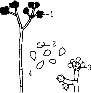 葡萄孢属 1.分生孢子聚集 2.分生孢子 3.膨大细胞 4.分生孢子梗 |