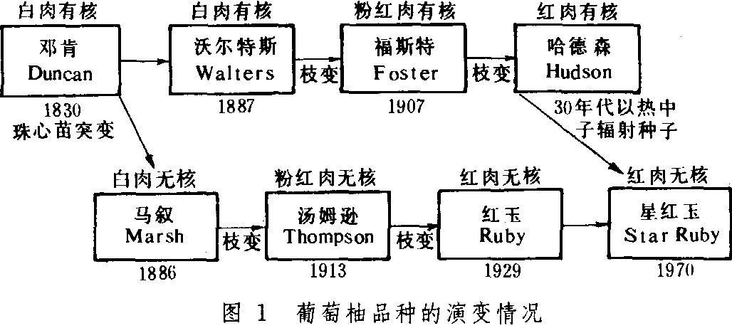 葡萄柚树势壮旺, 丰产性强, 在美国主产区单位面积产量比甜橙、宽皮柑橘和柠檬高,1975~1976年度平均每公顷产果39.787吨。 主要品种 最早栽培的是白肉多核的葡萄柚品种,以后通过选择芽变、珠心苗选种和热中子辐射诱变等途径, 先后获得了白肉无核, 红肉有核, 红肉无核等多种类型。葡萄柚的品种演变过程(图1)。 主要的栽培品种如下: ❶邓肯。是最古老的葡萄柚品种。果肉白色, 每果种子30~50粒, 一般在1月至3月成熟, 抗寒力强。 ❷马叙(图2)。果比邓肯小,果肉白色,每果种子0~6粒。最好的品系是无核的。成熟期较晚, 树上挂果延迟采收不会严重落果。是种植面积最大的品种。 ❸汤姆逊。果肉粉红色, 无核, 中果皮白色, 较马叙早熟, 可延迟采收, 但果肉的颜色会逐渐褪淡。 ❹红玉。果肉红色, 无核, 中果皮由于有红色胶体存在而呈玫瑰红色, 品质和成熟期与汤姆逊相似。 ❺星红玉。果肉红色, 无核或少核, 每果种子0~9粒, 中果皮有红色胶体。树势壮旺,树冠紧凑,叶片较窄小。花量多, 丰产, 果的大小很理想。果肉紧凑, 不易散开, 适于制切片罐头, 因加工后能保持原有色泽, 也适合制果汁。 栽培技术要点 多用嫁接繁殖, 国外曾用酸橙(Sour Orange)、兰卜莱檬(Rangpur Lime)、粗柠檬(Rough Lemon)等作砧木,20世纪70年代后期又采用施文格枳柚(Swingle Citrumelo)、特洛亚枳橙 (Tr-oyer Citrange)、摩顿枳橙(Morton Citrange)等作砧木以矮化树冠。中国用甜橙及红檬(Citrus li-monia Osbeck)作砧木,表现优良丰产。在中国的华南地区种植, 裙腐病、流胶病和溃疡病比较严重, 必须注意防治。栽培技术措施与甜橙相似。