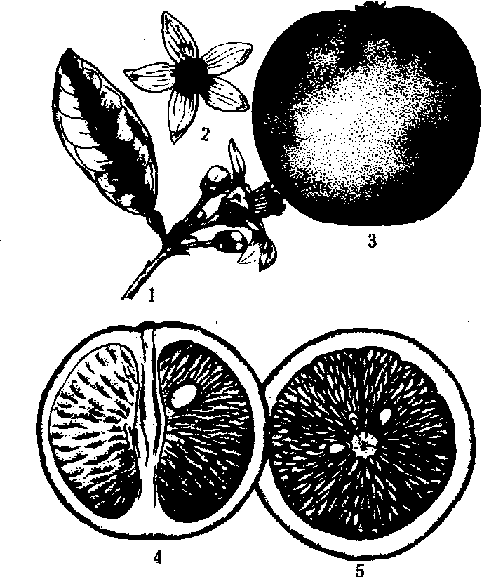 图 2 马叙葡萄柚 1. 花枝; 2. 花; 3. 果实; 4. 果实纵剖面5. 果实横剖面 经济价值 葡萄柚汁多, 肉嫩、风味特殊, 营养丰富, 每100毫升果汁含糖6.5~8克, 含酸1.3~2.4克, 维生素C27~36毫克, 含可溶性固形物8~10克,能增进食欲, 帮助消化。在欧美是早餐佳果。葡萄柚还可用来加工果汁、用果肉切片制罐头。是一个极有发展前途的柑橘树种。 葡萄柚grapefruitCitrus paradisi Macf.,芸香科,柑橘属。常绿乔木。2n=18。原产中美洲巴巴多斯。为柚与甜橙的自然杂种。美国栽培多,中国台湾、四川、广东等省有栽种。新梢、幼果无茸毛,枝梢披垂,翼叶倒卵形。果常成穗状似葡萄果穗,果球形或扁圆形,重约200~500 g;果皮光滑,淡黄色,油胞平生;囊瓣10~13,果肉细嫩多汁,味甜酸带苦。一般1~3月成熟。耐贮运。种子多胚,子叶白色。宜高温干燥气候。主要品种有马叙、红玉、邓肯等。果供鲜食或饮料用。 |