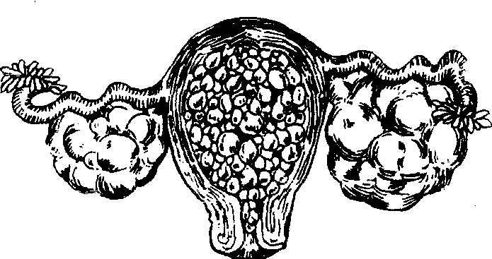 图7.4-1 良性葡萄胎及双侧卵巢黄素囊肿 葡萄胎putaotai一种良性滋养细胞肿瘤。正常时,受精卵在子宫内发育,逐渐形成胎儿、胎盘和与妊娠有关的附属物。当受精卵有缺陷时,组成胎盘的绒毛发生水肿变性,胚胎、胎盘被溶解吸收,子宫腔内充满大小不等、透明的水泡,水泡以细蒂相连,似串串葡萄,故得名 “葡萄胎”。葡萄胎可有以下表现: 葡萄胎是滋养细胞肿瘤的一种。由于绒毛滋养细胞异常增生和绒毛间质水肿,使绒毛变成了大小不等的水泡,互相间有细蒂相连,如成串的葡萄,故名。表现有停经和阴道流血,并排出葡萄样组织,子宫异常增大,可出现高血压、水肿和蛋白尿。治疗:及时作清宫术及定期随访;必要时进行预防性化疗。 |