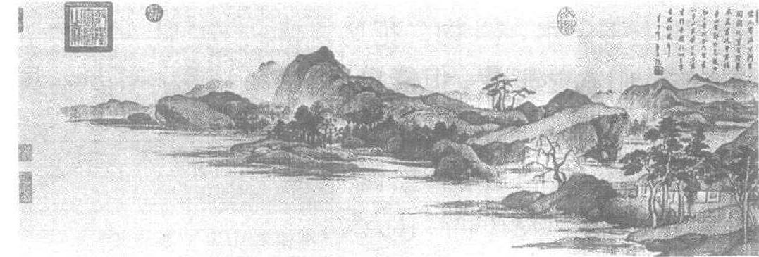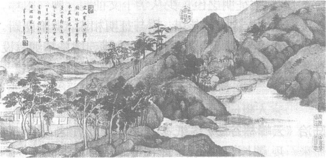 董其昌 《昼锦堂图》 之二 董其昌(1555—1636),字玄宰,号思白,别署香光居士,谥文敏。华亭(今上海松江)人。官至礼部尚书。是明末著名的书画家。他的著述影响也很大,尤其是他以禅宗分为南北两宗为依据,把古代山水画也分为“南北”二宗。北宗以李思训父子始至马、夏; 南宗以王摩诘至元四家。他“崇南贬北”,认为南宗是文人画,有书卷气,如南宗禅是 “顿悟” 的表现,有天趣。此论在明清两季影响颇深。 |