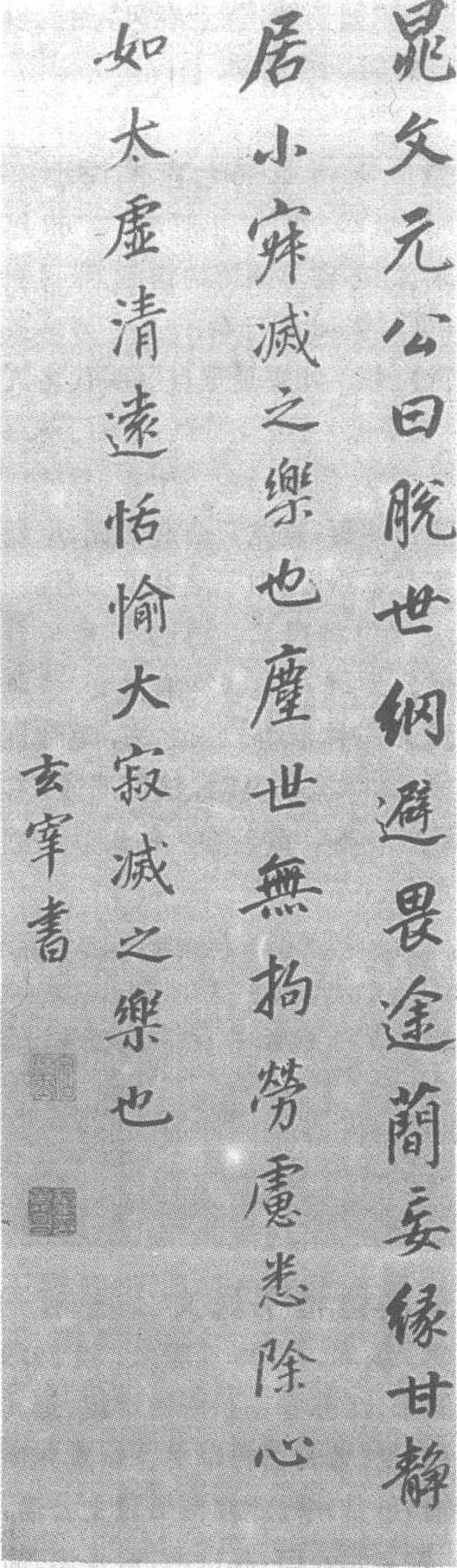 | 释义 | 董其昌楷书晁文公语轴明。纸本。纵93.5厘米,横29.9厘米。江苏省苏州博物馆藏。董其昌(见《董其昌行草书苏轼重九词轴》条目)书。此幅楷书晁文公语:“晁文元公曰:脱世网、避畏途、简妄缘、甘静居、小寂灭之乐也,尘世无拘劳虑悉除心,如太虚清远恬愉,大寂灭之乐也。玄宰也。”计4行48字,起首钤<玄赏斋>长方印,款下钤朱文<宗伯学士>、白文<董其昌印>。董其昌的楷书用笔受颜、柳影响甚深,但“寂”、“乐”、“尘”等字结体又有杨凝式的痕迹,功底颇厚,而又有他自家独特面目,其用笔提、按、起、止,笔笔清晰,干净利落,整幅自然、和谐、典雅。