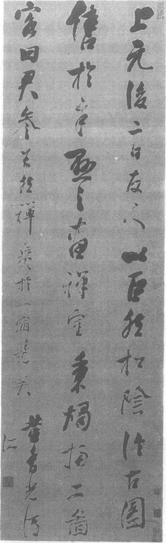 | 释义 | 蒋仁行书录董其昌题记轴清。纸本。纵92.7厘米,横27.8厘米。上海博物馆藏。蒋仁(乾隆八年—乾隆六十年,即公元1743—1795年),原名泰,字阶平,后在扬州平山堂得“蒋仁之印”古铜印,因易此名,号吉罗居士、女床山民、空实居士,浙江杭州人,清代篆刻家,家住杭州艮山门外二里徐家桥,置其居所云“古罗庵”,性情孤高,喜学佛参禅。篆刻师法丁敬,规模秦汉,参以己意,与丁敬、黄易、奚冈齐名,为“杭郡四家”之一。印史上他又与陈豫钟、陈鸿寿、赵之琛、钱松及杭郡四家合称为“西泠八家”。善书,书法绝不趋俗媚,彭绍升推其书法为当代第一。擅长山水,有逸趣。清彭绍升《二林居士集》云:“山堂性孤迥,家无儋石储,未尝干人,遇豪贵人辄引匿,求只字不可得;意有所适,淋漓挥洒,累巨幅不厌,人亦以此怪之。”又云:“山堂书品甚高,予以天真野逸评之。”清叶延琯《鸥陂渔话》云:“山堂生平书最精,由米南宫上窥二王,参以孙过庭、颜平原、杨少师。遇兴到时,若以墨沈倾纸,不能辨字,人益重之。”清徐珂《清稗类钞》云:“书法绝不趋媚俗,彭绍升推为当代第一。”此幅行书是录明董其昌题记一则,见《画禅室随笔》卷二《临巨然画题名》。文字稍有删节,其文云:“上元后二日,友人以巨然松《阴论古图》售于余,悬之画禅室,秉烛扫二图,客曰: ‘君参巨然禅几于一宿觉矣’。”款署“董香光语,仁”。款下钤白文<山堂蒋仁章>印,起首钤朱文<吉罗庵>长方印。蒋仁行书受董其昌书法的影响,行书间有草意,书法气势秀遒典雅,体势长短相杂,字体大小悬殊,笔画有粗有细,错落有致,上下字的起承虽少有映带牵丝,但笔断意连,形离神合。用墨由浓润而渐枯渴,笔意闲和萧散,自然活泼,无一俗态,耐人寻味,充分体现了蒋仁对书法艺术的深刻理解。