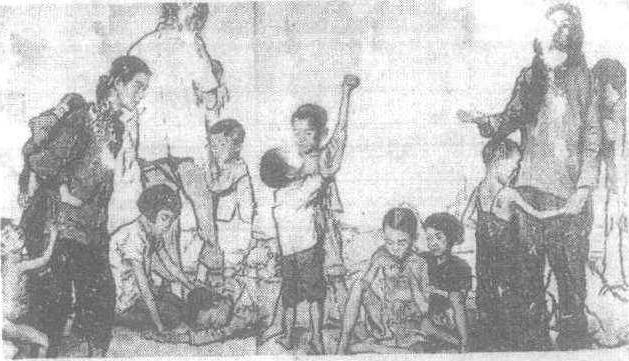 流民图 (部分) 蒋兆和 蒋兆和曾长期从事美术教育,任教期间,他致力于中国画教学的改革,在中国画造型基础课及水墨人物写生课教学原则和实施方案上自成体系,颇有影响。曾多次举办画展,并出版《蒋兆和画集》和《蒋兆和画选》等画册。 蒋兆和1904——1986画家,四川泸州人。1920~1935年在上海、南京从事商业美术和艺术教育。1928年在南京中央大学艺术系任教。1935年赴北平,先后在京华美专、北平艺专任教。1949年后任中央美术学院教授,流传下来的代表作《流民图》,创作于1942~1943年。该画描绘了抗日战争时期,沦陷区人民在日本侵略者的压迫下所过的悲惨生活。第一次在北京太庙展出时,为了转移日本帝国主义和国民党当局的注意,取名《群像图》,但仍未能逃脱厄运,展出不及半日,便被勒令停展。后来还遗失了半卷,现仅存残破的半卷。《流民图》以毛笔水墨,采用西画素描手法,刻画了受苦难的各阶层人民。人物形象大如真人,刻画细微,活灵活现,感染力极强。透过这“灾黎遍野,亡命流离,老弱无依,贫病交集” 的大众群像,控诉了日本侵略者的残暴和国民党统治的黑暗。 蒋兆和1904~1986国画家。原名万绥,泸州人。自幼随父习诗书画。1920年赴上海,作商业画像糊口。1927年后受徐悲鸿器重,先后在北平美专、南京中央大学艺术系、上海美专、京华美术学院、北平国立艺专从事美术教育。中华人民共和国成立后任中央美术学院教授。为中国文联委员、中国美术家协会顾问、全国政协委员。擅长国画人物,创作历史人物曹操、李白、杜甫等的肖像画,被誉为“中国的列宾”。代表作有《流民图》、《卖子图》、《孩子与鸽》和《丰收的喜悦》等。 蒋兆和现代画家。四川省泸州人。1904年5月9日生,1986年4月15日去世。专画人物。1920年赴上海画像,作广告画。1927年识徐悲鸿。1928年任教中央大学艺术系。1930~1932年任上海美术专科学校素描教授。1935年迁居北京。1936年返四川开始现代水墨人物画创作。1937年春返北平任京华美术学院教授、北平艺术专科学校教师。1947年受聘于国立北平艺专。1950年起任中央美术学院教授。1938年作《阿Q像》。1942年始作《流民图》卷(120.27cm×2600cm)绘100多个人物形象,1943年9月完稿,10月29日《流民图》初展于北京太庙,1949年展于上海。1956年作《杜甫诗意图》。 |