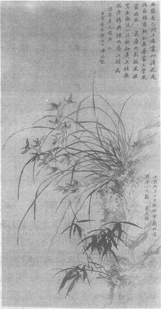 | 释义 | 蒋廷锡幽兰丛竹图轴清。蒋廷锡绘。绢本水墨。纵97厘米,横51厘米。江苏省南京博物院藏。蒋廷锡(公元1669—1732年),字扬孙,一字酉君,号西谷,一号南沙,又号青桐居士,江苏常熟人。康熙四十二年(公元1703年)进士,官至大学士,谥文萧。善画花卉、草虫,以逸笔写生,风神生动,意度堂皇,点缀坡石水口,无不超逸。他的没骨花鸟画,继承了恽寿平风格而负盛名。亦工诗、书,著有《青桐轩》诸集。此图右侧画岩崖一角,岩崖上画一撮幽兰,向左倾斜,花盛叶茂,婀娜多姿,互相交错,神韵生动。兰花下面。画一丛细竹,也向左侧伸展,竹叶劲挺,寥寥几笔,便表现了竹叶的韵致。画法用没骨法,笔法工率简出,雅致天然的幽兰,洒脱爽丽的翠竹,简率草逸的山石,皆生动传神,神彩飘逸。右侧自题:“壬寅九月十日临松雪兰竹”,署“蒋廷锡”,钤<蒋廷锡印>、<青桐居士>朱文二方印。壬寅为康熙六十一年(公元1722年)。右上角有陈元龙题七绝二首,款署“壬寅长至前五日,陈元龙”,钤<元龙之印>白文方印、<乾斋>朱文方印。