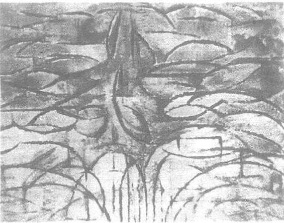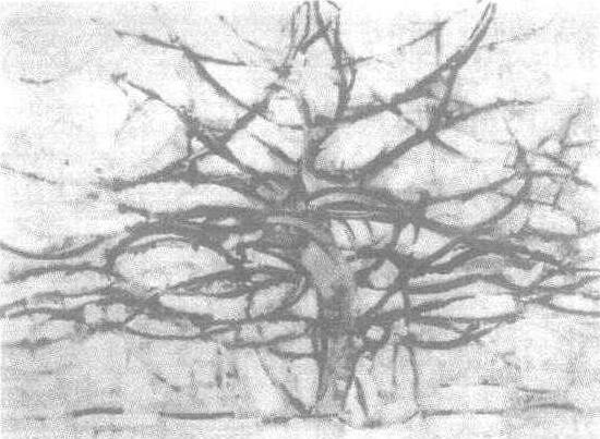 开花的苹果树 这可从他反复画的著名的“树”的连作看出来。《红树》使用了鲜艳的色彩,写实地描绘了弯曲的树枝,我们可以感受到大树和它周围小草的生命力。接下来的《灰树》,枝桠伸展到了图画的边缘,图画把树“限制”在自己的空间里,树木及其生命已不再是绘画的主题,主题是树与其他东西的关系。为此而省略了树的地点特征。在第三幅《开花的苹果树》 中,树干和树权全变成了直线和弧线,背景则是一片粉红色和灰兰色暗示花朵和天空。 正当蒙德里安在荷兰热衷于创作抽象化作品的时候,1912年他有机会来到了巴黎。在巴黎,他开始接触到后期立体主义。那是 一种观察现实的新方法,使他更加坚信自己正在走的路。不过当立体派画家把真实的实物拼贴到画面上去的时候,他就不愿再跟着他们跑了。他不能允许在自己的画上表现真实的东西,因为它们会引起感情,而感情会遮蔽纯静的自然。 后来蒙德里安又回到了荷兰,他创造了 一种全部无代表实物的风格,如我们在本图中所看到的那样。他称其为“新造型主义”(在美术史上又叫做风格主义运动)。它是当时一本荷兰杂志的名字,专门传播蒙德里安的观点。归纳其基本思想就是: 物体的精髓可以用最简单的方式表现出来,只要用横线、竖线和三原色就行了。如果你把一件东西分析、简化到 一定程度,你就能得到它的精髓。 |