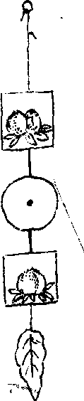 将三块白色木板,两方一圆,串在一起,圆木板放在中间,在两块方木板上,分别绘上如意桃及寿桃。在中间圆板上点一红点。这类幌子表示专门出售各种蒸食。