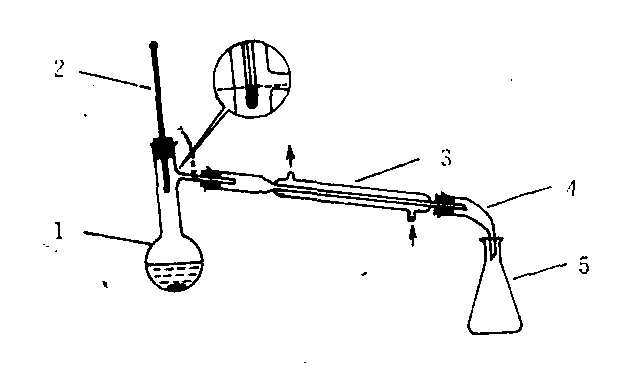 实验室蒸馏装置 1.蒸馏烧瓶 2.温度计 3.水冷凝器4.尾接管 5.接收瓶 蒸馏利用液体混和物中各组分挥发度的不同,进行纯化、分离物质的一种操作。将液体混和物加热至沸,在蒸气中含较多的易挥发组分,而在剩余液中有较多的难挥发组分,因此可使混和液中各组分部分乃至完全分离。 蒸馏利用液体混合物中各组分挥发性不同而通过加热实现完全分离或部分分离组分的方法。通常有简单蒸馏、精馏、恒沸蒸馏、萃取蒸馏、蒸汽蒸馏、真空蒸馏、分子蒸馏等。工业上应用很广泛。 |