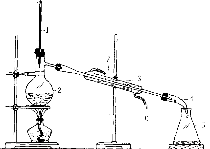 1 温度计 2 蒸馏烧瓶 3 冷凝管 4 尾管5 锥形瓶 6 进水口 7 出水口