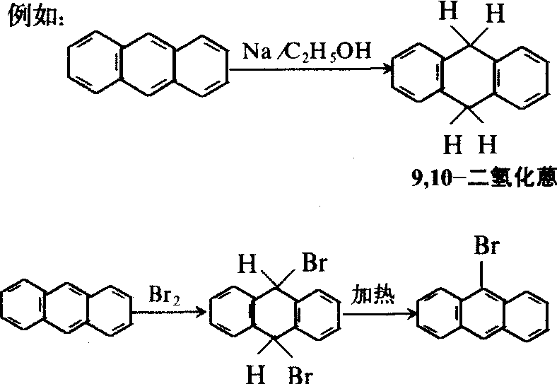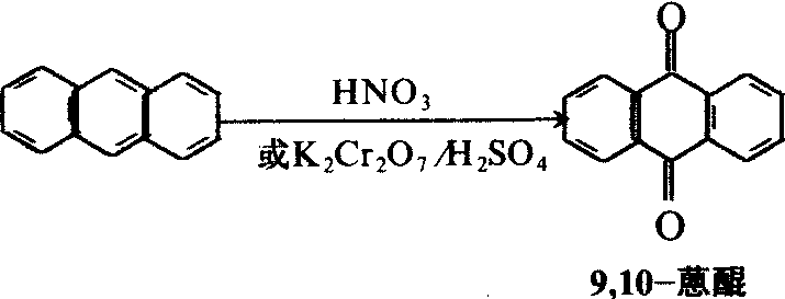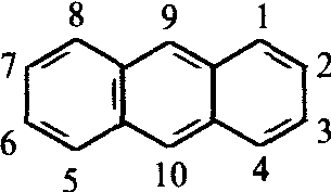 蒽为无色片状晶体,有蓝紫色荧光; 熔点为216℃,沸点为340℃;相对密度为1.283 (25/4℃); 容易升华; 不溶于水,难溶于乙醇和乙醚,易溶于热苯。 蒽分子中所有的原子都处于同一个平面上,每个碳原子都以sp2杂化轨道与相邻碳原子的sp2杂化轨道或氢原子的1s轨道重叠形成σ键,每个碳原子的p轨道均垂直于蒽分子平面,形成环闭的共轭体系,蒽具有芳香性。蒽环上电子密度的分布不是完全平均化的,所以碳碳键的键长不完全相等,芳香性比苯、萘、菲要差。 蒽的一元取代物有3种,其中1,4,5,8位相同称为α位,2,3,6,7位相同称为β位,9,10位相同称γ位或中位。化学反应主要发生在最活泼的γ位。例如氧化反应: