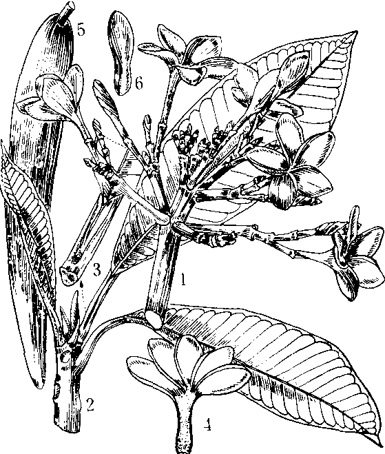 图 5 鹤木 早春2~3月发芽,4~7月为旺盛生长时期,7~8月开花,开花后顶芽生长明显减弱。11月果实成熟。12月落叶。鹤木是速生树种,在广东、广西、云南、福建、台湾等省、区都有自然分布。每年4月底5月初可开始剪枝采叶养蚕。用鹤木叶养蚕,蚕体健壮多粉,发育齐一,蚕座干爽。全龄期比食蓖麻叶的长2天左右,产茧量为食蓖麻叶的85%~90%。鹤木再生能力较强,枝梢剪伐后可重新发芽生长。如果在秋季剪枝,冬季仍可获得鲜叶养蚕。全年可剪枝养蚕3~4次(图5)。 鸡蛋花 属夹竹桃科,落叶灌木。叶长20~40厘米,宽7~12厘米。鸡蛋花原产热带,为观赏植物,花可作药用。中国广东、广西、云南、福建、台湾等省区均有种植。适宜生长于疏松的土壤,多见于园林或风景区。利用枝条极易繁殖。鸡蛋花叶可全龄养蚕,蚕喜食,发育良好。养蚕成效与木薯叶相近。若专供作养蚕饲料,全年每株可采叶20~40千克(图6)。