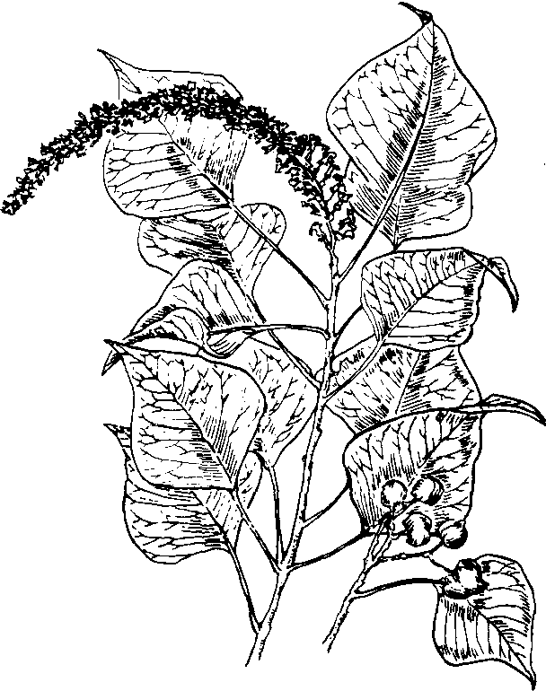 乌桕 属大戟科,落叶乔木。中国黄河流域、长江流域以及南方各省都有分布,乌桕属的种类较多,养蚕效果相差很大。其中以山乌桕、圆叶乌桕的养蚕效果较好。用乌桕叶养蚕,全龄期比用蓖麻叶饲养的长4~5天,产茧量相当于用蓖麻叶饲养的60%~70%。如果1~4龄用蓖麻叶或木薯叶饲养,5龄期改用乌桕叶,其产量可提高10~15%,龄期也可缩短2~3天。乌桕叶较适宜用作大蚕饲料(图7)。