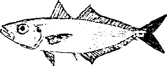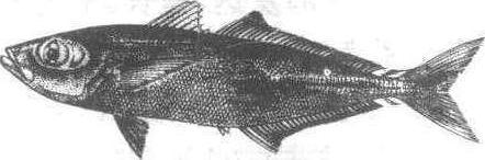 图274 蓝圆鲹 蓝圆鲹round scadDecapterus maruadsi Temmincket Schlegel,又称巴浪、池鱼。硬骨鱼纲,鲈形目,鲹科。长约30cm。体纺锤形,稍侧扁。眼被脂睑。第二背鳍及臀鳍后方各具一游离小鳍。侧线前部弯曲;后部平直,具棱鳞。体背部青灰色,鳃盖后上角有一黑斑。为暖水性中上层鱼类,洄游性显著。游泳迅速,喜结群,有趋光习性,为光诱围网重要捕捞对象。广食性,摄食桡足类、介形类、虾、小型鱼类。分布于印度洋和太平洋,中国和日本沿海均产。中国年产量为25万~35万t,主产南海,为重要经济鱼类。近缘种有勒氏圆鲹(D.russellii),分布于印度尼西亚、菲律宾、泰国、马来西亚。肉质稍粗,肉味尚佳,供鲜食或腌制盐干品,也可制罐和鱼粉。