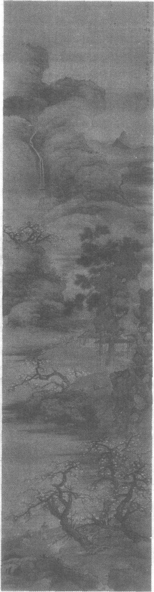 | 释义 | 蓝孟梅花书屋图轴清。蓝孟绘。绢本设色。纵181厘米,横47.1厘米。浙江省博物馆藏。蓝孟见《蓝孟秋林逸居图轴》条目。此图描绘的是梅花盛开季节,梅花书屋周围的景色。画面左侧取水塘局部,坡岸迂回,近水处几间简朴的书屋隐现。假山兀立,老梅枝茎虬盘,花朵顾盼生姿。一老者策杖徜徉于梅林中,书僮抱琴紧随。远处高山圆浑,飞瀑如练,雾霭氤氲。作者的笔墨、设色,师法其父蓝瑛。坡地用石绿画成一假山敷以石青;梅花的设色最为细致,以淡墨衬染后用铅粉点簇。不同的色彩和笔墨丰富了景致的内涵,在师法前辈的基础上颇具自己的风格。