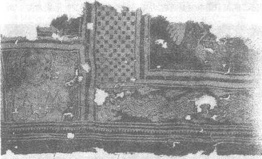 | 释义 | 蓝白蜡染花棉布东汉。残长86厘米,宽45厘米。1959年新疆维吾尔自治区民丰北大沙漠一号墓出土。新疆维吾尔自治区博物馆藏。这是一块蓝白蜡染装饰性宗教图案棉布,出土时与另一块长81厘米,宽48厘米的米格和圈点纹蓝白印染棉布同盖在盛有羊骨的木碗上。此幅布中央为一佛像,已残缺,佛像左侧为一小方块纹边饰,下面为龙与鸟兽纹边饰,边饰左下方有一方形饰区,内饰一佛像,后饰有佛光,颈项上挂一串佛珠,袒胸,手持角杯,内插有花果,佛目视前方,作授花状,其形象生动、逼真、自然。边饰外有带锯纹齿的边框,其余部份残缺。这是现存最早的蜡染印花织物。