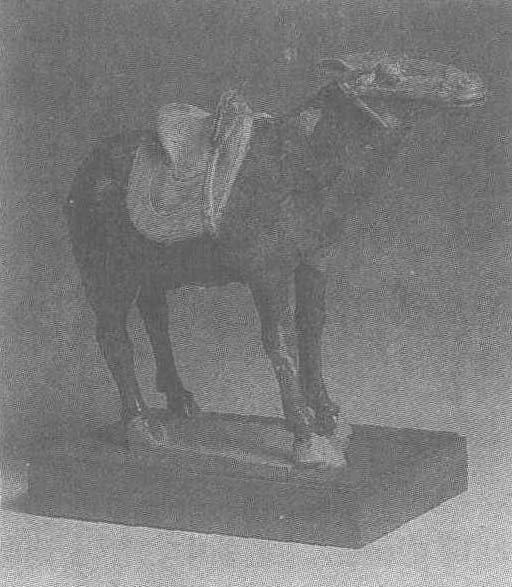 | 释义 | 蓝釉陶驴唐。高23.5厘米,长26.5厘米。1956年陕西省西安小土门出土。北京中国历史博物馆藏。蓝彩是唐代较为名贵、稀少的颜料。此驴除四蹄外均罩以蓝釉。驴四腿直立于踏板之上,伸颈、昂首,双目圆睁。颈部额前的鬃毛清晰可辨,体态健壮有力。装有辔饰,背上有鞯(衬托鞍的垫子),鞍呈米黄色,靽(后部的革带)、鞅(系于腹部的革带)等装饰俱全。其神态和行为似驮物间隙的稍憩,塑造得十分自然传神。