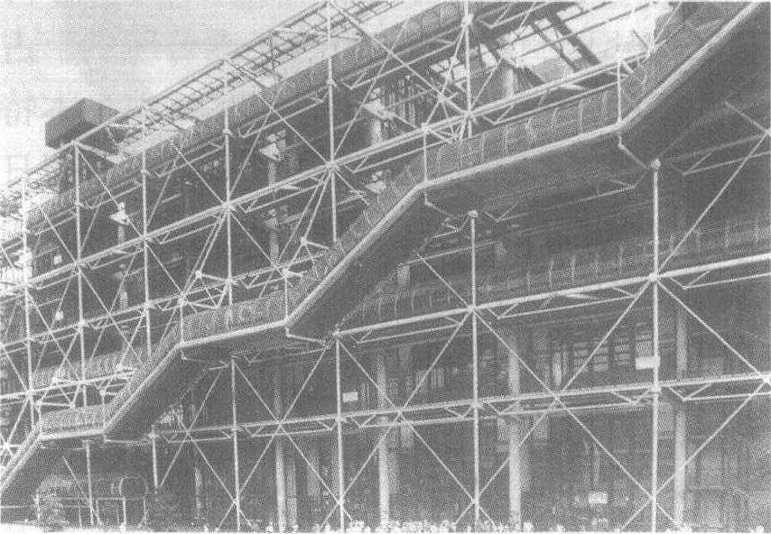 蓬皮杜艺术和文化中心 蓬皮杜艺术和文化中心简称蓬皮杜中心,设在法国巴黎市中心区。英国建筑师R、罗杰斯和意大利建筑师R. 皮亚诺合作设计,建于1972—1977年。蓬皮杜中心主要包括四个部分:公共图书馆 (16000m2)、现代艺术博物馆(18000m2)、工业美术设计中心(4000m2)、音乐和声响研究中心(5000m2),连同其它附属设施,总建筑面积为103305平方米。该中心外貌构思大胆、奇特,造型新颖、别具一格。钢结构的梁、柱、桁架、拉杆等甚至涂上颜色的各种管线都不加遮掩地暴露在立面上。在面对广场一侧的建筑立面上悬挂着一条巨大的透明圆管,里面安装有自动扶梯,作为上下楼层的主要交通工具。蓬皮杜中心相似于20世纪60年代在英国出现过的“阿奇格兰姆” 建筑学派的主张。就广义而言,蓬皮杜中心的建筑设计也可以说是代表了现代建筑中 “重技术派” 的作品。 蓬皮杜艺术和文化中心简称蓬皮杜中心,设在法国巴黎市中心区。英国建筑师R.罗杰斯和意大利建筑师R.皮亚诺合作设计,建于1972—1977年。蓬皮杜中心主要包括四个部分: 公共图书馆(16000m2)、现代艺术博物馆(18000m2)、工业美术设计中心(4000m2)、音乐和声响研究中心(5000m2),连同其他附属设施,总建筑面积为103305平方米。该中心外貌构思大胆、奇特,造型新颖、别具一格。钢结构的梁、柱、桁架、拉杆等甚至涂上颜色的各种管线都不加遮掩地暴露在立面上。在面对广场一侧的建筑立面上悬挂着一条巨大的透明圆管,里面安装有自动扶梯,作为上下楼层的主要交通工具。蓬皮杜中心相似于20世纪60年代在英国出现过的“阿奇格兰姆”建筑学派的主张。就广义而言,蓬皮杜中心的建筑设计也可以说是代表了现代建筑中“重技术派”的作品。 蓬皮杜艺术和文化中心高技派代表作之一。法国总统蓬皮杜为纪念前总统戴高乐而倡议修建的艺术和文化中心,于1977年在巴黎落成。整座建筑暴露结构、暴露管道,并涂以醒目的色彩,巨大的空间灵活可变,装配化的结构构件可拆装更换内部种种设施,技术先进,堪称一流。中心总面积约10万m2,地上6层,地下4层。地上每层高7 m,宽48 m,长168 m,建筑前后立面各挑出6 m作为观众使用的水平和垂直交通道。各种管道和机械设备也都设在前后挑出部分,整个建筑为各种纵横交错、色彩鲜艳的管道所包围,像一座巨大的炼油厂。建成这样一座高技派的文化和艺术中心,在法国内外曾引起不少争议。 |