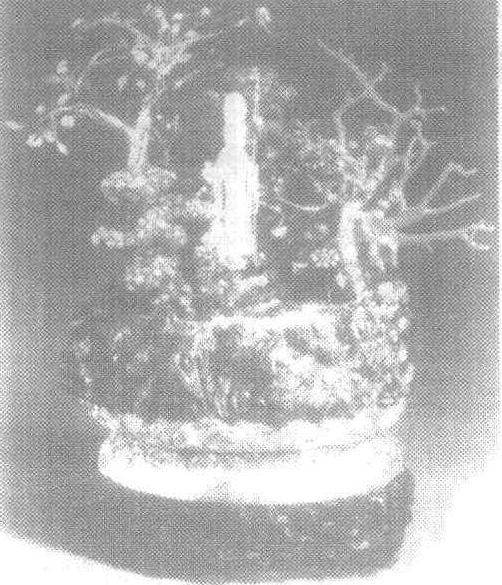 | 释义 | 蓬莱仙境盆景清代宫中陈设品,系乾隆年间浙江巡抚罗琅玕呈献内廷之贡品,蓬莱为神话中海上三座仙山之一,居住于蓬莱仙山者都是道行高超,长生不老的神仙。因此贵为天子的皇帝希望自己能长生不死,永享荣华富贵,便企求也能同神仙一样居于蓬莱仙境。此件盆景就是迎合皇帝心意而特意制作的,皇帝在寿诞时将盆景陈设于宫殿,取其长寿永福之望,示其吉祥之意。这件盆景用红蓝宝石及其他各种珍贵玉石堆砌成基本形状,上嵌珍珠、黄金。紫檀木制成的底座上放置用孔雀石垒成的蓬莱仙山,苍翠可爱,自然成趣。山间布置了用珍珠、宝石嵌镶成的各种寿石花草。仙山四周有铜胎镀金、嵌满珍珠的松树和梅花树,嵌宝石、碧玉的桃树,以及红珊瑚制成的其他树。山间树下又有用玉制成的寿星、侍童和梅花鹿。整个盆景气氛热烈,主题突出。盆景用料极为奢华,其用上等珍珠280颗,红蓝宝石300余粒,各种玉石100余枚,宝光闪烁,眩人眼目,造成瑞气盎然的效果。