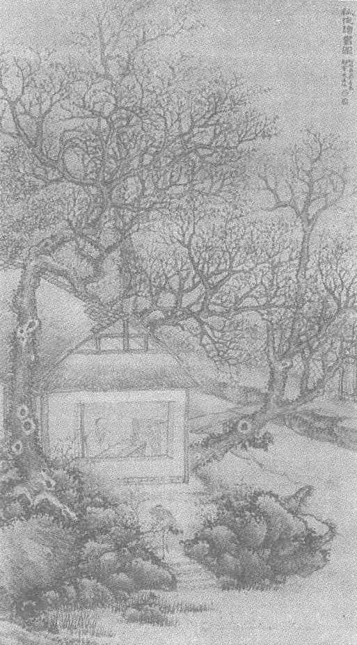 | 释义 | 蔡嘉秋夜读书图轴清。蔡嘉(见《蔡嘉春江叠嶂图卷》条目)绘。纸本设色。纵63.7厘米,横37厘米。北京故宫博物院藏。此幅画二棵秋树掩映着一间茅屋,一位书生坐在窗边书桌之前,挑灯攻读。窗幔高卷,小书僮侍立一旁。一条小溪绕屋而过,窗下溪边台阶上一只丹顶鹤侧颈安睡,像是早已习惯了屋内的灯光。水边芦草丛生。屋前老树一直一斜,密枝疏叶,残红点点,秋意浓浓。屋侧小桥横架,柴门紧闭,篱墙隐见。屋后修竹一片,环境清幽。虽然没有画月亮,但背景淡淡的灰白色恰如银色的月光。山石树干以淡墨皴染,重墨点苔;房舍、人物描画精细,用笔简练。自识:“秋夜读书图,松原弟蔡嘉为静宰先生作。”钤〈岑州〉、〈蔡嘉〉两方印。