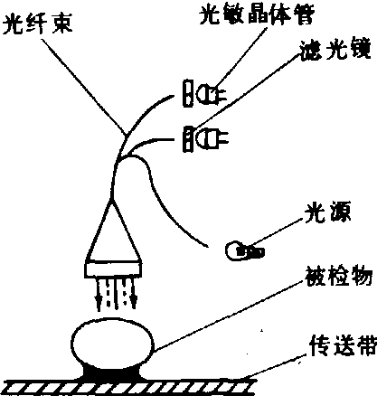 图2 复合式光电选果装置示意图 表皮颜色分选装置 被检果实表皮的颜色,与其内在质量(含糖度、含酸度、维生素含量等)有密切关系。利用特定波长的光,如可见光(包括激光)、不可见光或他种电磁波照射被检果实,再借助光敏晶体管、光纤束等获得被检果实的表皮分光反射强度,并与所需等级的标准相比较分选。应用传感器的色泽选果装置(图3),借助光纤束导管使反射光经过干涉滤光镜后再交由光敏晶体管鉴别,测出其强度,根据所定的分级标准由分级自动线上的移位寄存器决定其相应的排出口。