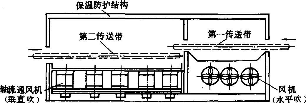 图3 复合式切丁机示意图 马铃薯去皮机 可采用机械摩擦、机械削皮或用蒸气、碱液去皮。应用最广泛的是机械摩擦。中国的马铃薯去皮机采用滚动磨削方法,主要依靠旋转的磨盘带动马铃薯与砂盘及周围的W型凹凸板(或砂石壁、硬橡胶板等物)相对运动去皮。磨盘一般采用水平砂轮盘。马铃薯在加工过程中应不断注水,冲去磨下的表皮。有的出料口与切菜机相连接,成为马铃薯磨切机。 剥蒜机 中国于1983年研制成功。它比人工剥蒜提高工效135倍。蒜瓣经过滚筒上的胶皮锥和凹板上的胶皮锥相互揉搓脱皮。该机主要由机架、凹板、滚筒和卸料机构、传动皮带轮等组成。滚筒直径400毫米,滚筒转速118~120转/分,胶皮锥直径25毫米、高90毫米,每小时可生产83公斤,剥净率90~95%。 蚕豆开口机 中国1984年研制成功。工作时通过有轴向凹槽的一对木滚轮旋转,携带泡好的蚕豆向下输送时,固定于木滚轮上的圆盘刀将蚕豆开口,两木滚间距20毫米。圆盘刀距20毫米,刀盘直径大于木滚轮直径约8~10毫米。该机有机动和手动两种。机动的生产效率为每小时400~450公斤,手动的每小时100~150公斤。 酱菜加工机械 中国70年代前酱菜生产主要是手工操作,80年代以来有较大的发展,有的酱菜厂主要生产环节已使用机械。通用设备有: 多能切菜机、切条切丁机、离心切丝机和各种切菜机。专用设备有脱盐机、压榨脱水机、蓑衣萝卜机、圆盘切口机、液压花样成型机、轧辣椒机、搅拌机、行走式和桁架式抓菜机、真空包装机等。70年代一些发达国家采用真空速制酱菜新工艺腌制酱菜。中国1980年河南商丘和天津也开始应用速制酱菜新工艺,分别采用立式和卧式渗酱罐渗酱。真空压缩速制酱菜新工艺是把已被腌制过的菜胚放在密封的容器(渗酱罐)内抽气使之真空,同时也使菜胚组织中的气体相应地抽出,然后再加适当压力把酱汁强制压渗到菜胚组织内。真空→压缩→常压→再真空→再压缩,如此反复进行几次,使酱汁快速置换酱菜组织中的水分,速成酱菜。速成酱制乳黄瓜只需3~4天,酱笋片为24小时,酱疙瘩丝为15小时。速制酱菜工艺的主要机械设备有: 渗酱罐、真空罐、滤清罐、贮气罐、空气压缩机、桥式起重机、气动抓菜机、压榨脱水机、切菜机和滤汁机等。 速冻菜加工机械 速冻菜加工是蔬菜贮存保鲜的有效措施之一,20世纪30年代开始应用。中国80年代初研制成蔬菜速冻装置。速冻方式很多,用制冷剂直接作为介质冻结食品叫直接冻结。用制冷剂通过某介质冻结食品叫间接冻结。间接冻结有静止空气冻结、半送风冻结、送风冻结、接触冻结、浸渍冻结; 直接冻结包括冰盐混合物冻结、液氮冻结、氟里昂冻结。用空气作介质进行速冻应用最广泛。蔬菜速冻机中多采用送风冻结装置。食品快速冻结机主要由蒸发器组、风机、液压间歇输送机构和保温隔热装置等组成。快速冻结机采用多组满液式蒸发器,制冷剂用氨水溶液。在蒸发器上部装淋水管,可根据需要分台冲霜。为了加快冻结,用轴流风机进行强迫对流冷却,用45度挡风板加快对流循环。间歇输送机构采用液压控制水平传动的推进装置。它由推进架和水平推进机构组成。用一台液压机控制两个油缸,分别带动上下两组齿条、齿轮,实现推盘的往复推进。保温隔热层四壁及顶部采用三层软质纤维板、聚苯乙烯泡沫板和油毛毡的组合式结构,内外层都用镀锌铁板包合。底层做保温处理。中国研制的蔬菜速冻装置(图4)采用单体悬浮冻结的方式。其工艺流程是: 把经过挑选整理和初加工的蔬菜进行清洗,漂烫、冷却、振动筛控水,再经检验输送带(再次挑出残次品)、斗式提升机送入蔬菜冻结装置第一传送带初冻,再进入第二传送带被上吹的冷风吹成悬浮流散状态,在移动过程中被急速冻结。以速冻菜豆为例: 速冻温度为-30~-40℃; 冻结时间为10~13分钟,生产率每小时为750~1000公斤。垂直向上的风速在6~8米/秒时可防止速冻菜结块。 ![]() 图 4 蔬菜速冻装置示意图 |