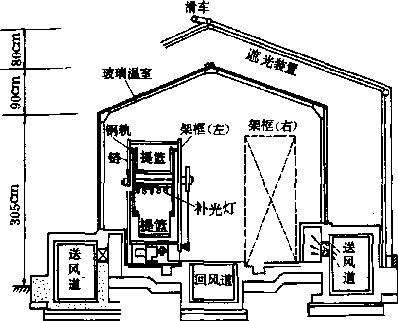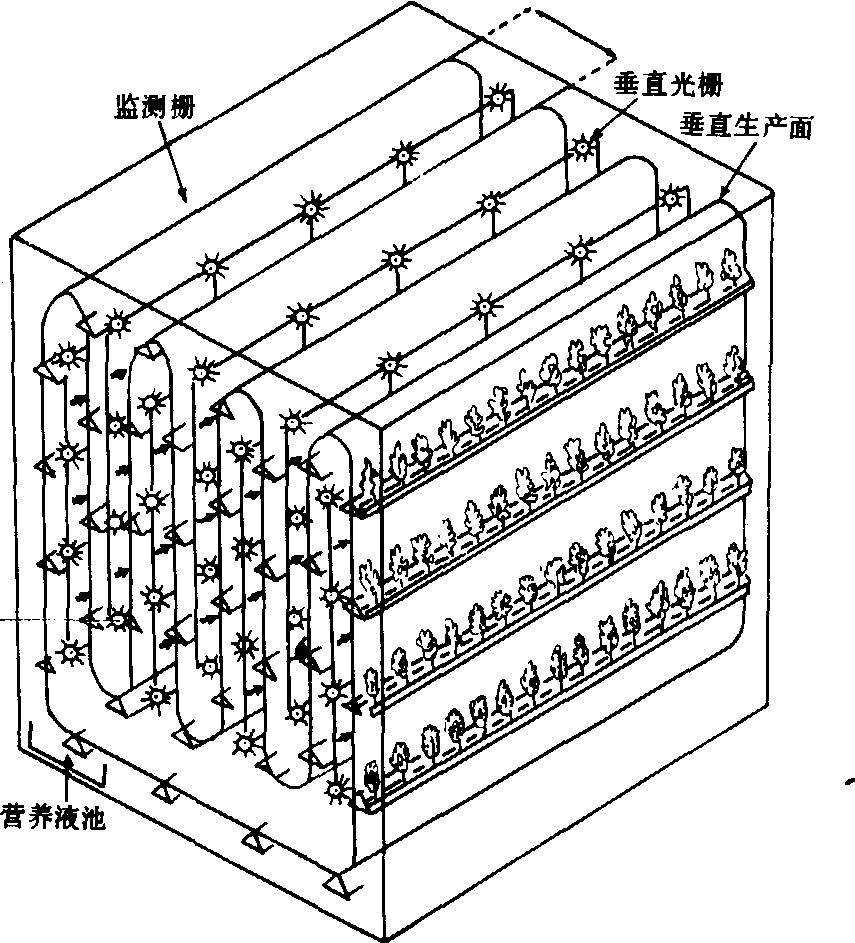 图 1 鸭儿芹的工厂育苗室示意图 奥地利的塔式番茄工厂,厂房外壳是双层保温材料密闭的高大建筑物(外壳导热系数为0.3~0.5大卡),形成密闭的生产系统。厂内有番茄生长所需的光照、温湿度、二氧化碳、氧气、矿物营养等最佳的综合环境条件。番茄全生育期从播种到收完仅需120天。根据番茄各生育期的要求,厂内设有各种不同的与之适应的厂房,如育苗室、栽培室、收获分级包装室等。其中栽培室内有链式传送带竖架装置,将栽培槽悬挂在传送带上,槽内番茄植株用聚烯烃泡沫树脂块固定。还有营养液供给系统、空气过滤消毒装置、补充二氧化碳装置和人工照明装置等。厂内综合环境、营养液、动力设备等各项控制指标全部存储在电子计算机中,按照程序自动调控。人工照明是棒状钠灯(蓝光多),在塔式栽培室有10.8万立方米空间,安装400瓦钠灯一万支,每两个相邻的垂直生产面之间有一个垂直光照栅栏,每支钠灯负担照明面积6平方米,灯光呈交叉三维空间光照,番茄叶面受光强度可达2万勒克斯; 栽培槽以2米/分钟速度上下往返垂直移动,光照均匀,且不易灼伤叶面。一般一昼夜12小时连续受光和12小时断光交替进行。室内热源是灯光辐射热,昼夜温差保持6~10℃,相对湿度保持50~70%,空气成分保持氧气含21%、二氧化碳为2 000ppm,其来源除植物自身同化与呼吸作用互补之外,不足部分由人工补足。采用标准营养液,每半月更换一次新营养液。营养液有两个供应处: 一处是当栽培槽运行到最低处时,使番茄根系浸渍在底部的营养液池中,根系吸附营养液,离池后根部多余的营养液淋出再流回池中; 另一处在每个垂直生产面的最低处有喷头喷洒补充营养液。室外新鲜空气进入密闭厂房时,经过过滤和紫外线灭菌;同时番茄植株一直处于运动状态,通风良好,病虫不易发生,但仍需经常检查,及时防治(图2)。