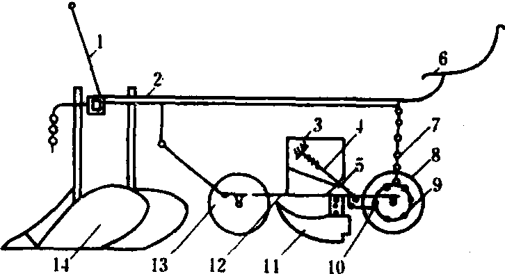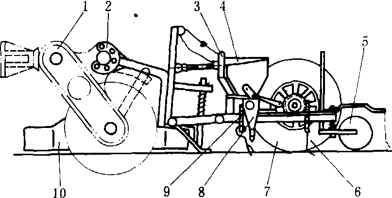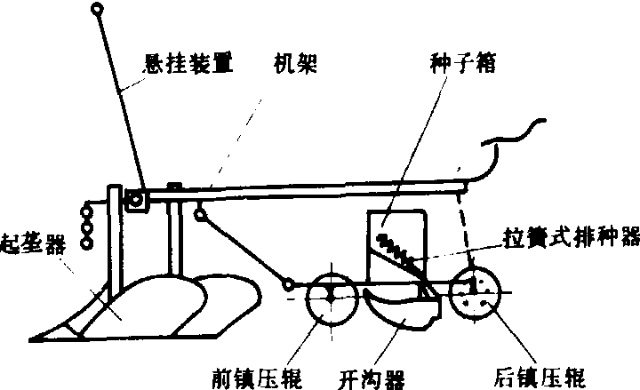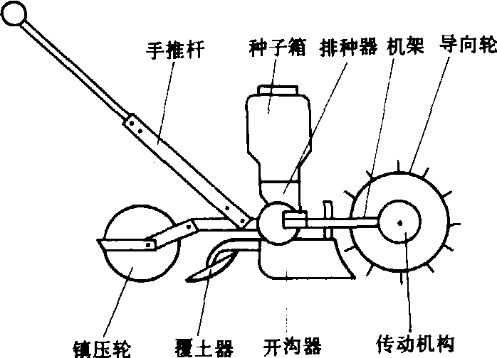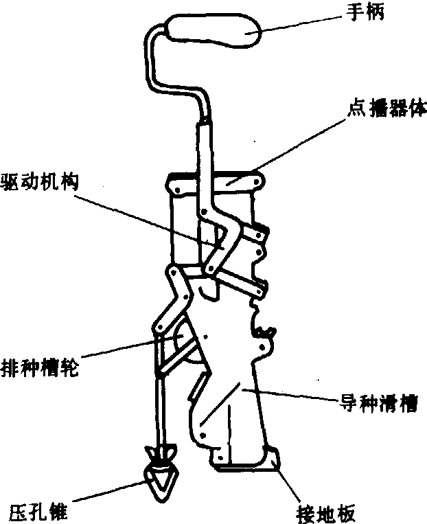 图 2 人力手提式点播器 蔬菜起垄播种机 以CXL-4型蔬菜起垄播种机为例(它与中型拖拉机配套),主要由机架、起垄器及播种单组三部分组成(图3)。可一次完成起垄、开沟、播种、覆土、镇压等作业,最大作业宽度为260厘米,分为四个播种单组,一次可播四行。鸭嘴形起垄器起垄高12~25厘米。播种单组由排种器、前后镇压辊、开沟器及种子箱组成,与播种机架采取浮动吊挂式联接,具有地形仿形性能。排种器为拉簧式,排种拨杆的一端被镇压辊的拨指弹动时,另一端即带动排种拉簧抽动排种孔的阀门,将种子排出。种子播后成条状分布。有的起垄播种机采用整体式传动,传动地轮的工作位置要比播种单组低一个垄高,使之走在比较坚实的沟底,以减少滑移,提高播种准确度。单组式播种机大多带有施化肥、施杀菌剂或除草剂的装置。