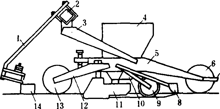 图2 蔬菜精密播种机单组 1.土块清除器支架; 2.机架; 3.播种单组牵引杆;4.种子箱; 5.单组前、后支架;6.后镇压轮; 7.刮土板; 8.覆土器; 9.种沟镇压轮;10.排种器; 11.开沟器; 12.单组前支架; 13.前镇压轮; 14.土块清除器 主要工作部件 是排种器和开沟器。根据蔬菜种子形状不规则,品种繁多的特点,它们需按所播蔬菜品种而配备。条播用排种器按种子尺寸形状而改变结构参数,成为不同结构的专用条播排种器;穴播则采用不同窝眼尺寸的垂直窝眼轮式排种器等;精播排种器需按种子性状配置型孔尺寸。开沟器无论是采用滑刀式、锄铲式和圆盘式,均需根据蔬菜浅播、窄行密播或宽幅播的要求,改变结构。滑刀式开沟器要有限深板和V型断面实心底托;锄铲式开沟器可制成有散种器的宽幅铲式开沟器和能同时开出多条种沟的窄行密播用船型铲式开沟器等;圆盘开沟器应装置限深环等,成为专用型工作部件。 蔬菜播种机vegetable sowing machine用排种器将蔬菜种子均匀地播入播种沟中并随即覆土的机械。主要用于大白菜、萝卜、胡萝卜、芥菜、菠菜等露地菜的播种,欧、美一些国家也用于莴苣、番茄、芹菜、洋葱及甘蓝类蔬菜的田间直播。根据排种器的不同排种方式,蔬菜播种机可分为条播机、穴播机和精密播种机。条播机播后的种子成条状分布,使用槽轮式、离心式、蝶轮式、刷轮式及选孔自流式排种器; 穴播机播后以几粒种子为一组和大体相等的间距布于播行内,采用垂直窝眼轮、倾斜窝眼轮、匙式、型孔带式排种器; 精密播种机播后的种子成单粒等间距分布(见蔬菜精密播种机)。根据蔬菜垄作、畦作的方式不同,播种机可分为垄上播种机和畦田播种机。垄上播种机适用于大白菜、萝卜等的播种,机型多为单组式结构。畦田播种机适用于行株距较小的叶菜播种,多为整体机型。根据播种机的配套动力不同,可分为人力式蔬菜播种机和机引式或悬挂式蔬菜播种机。人力的多为单行机,而机引的或悬挂的为多行机。