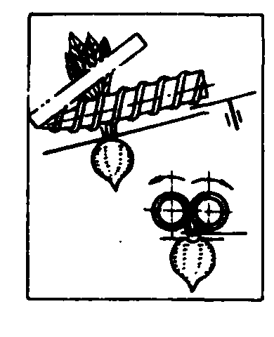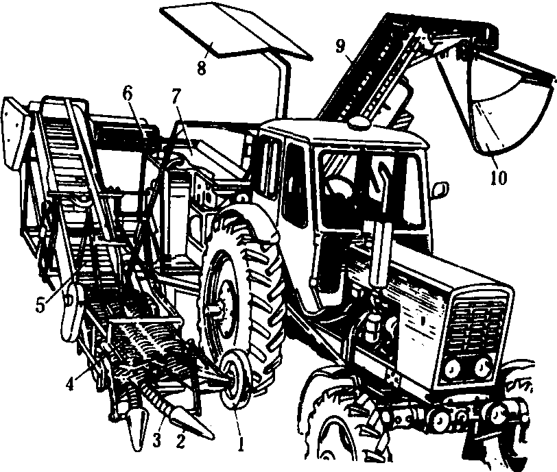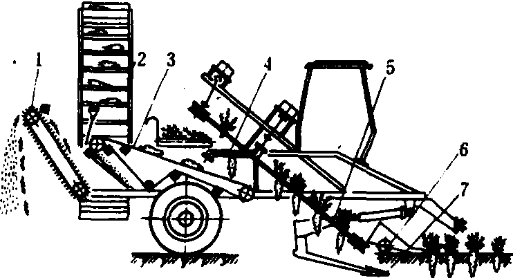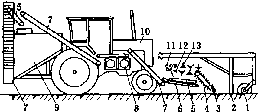 图4 齐平器和茎叶收集机构类型简图 平板铰接式齐平器 由两个平行的弹性平板组成。工作时,借助拔取器将块根引向齐平器,并根据叶束的厚度,平行弹性平板间间隙可自动调节。这种齐平器属于从动齐平器,工作时块根的运动是借助拔取器进行的。块根及其茎叶与齐平器的摩擦力,会使块根旋转,这对茎叶切割器工作性能有不良影响。块根在行上不可能排成一条直线似地生长,如有高于同行两边的块根,则此块根将更早地被推压和齐平,从而将其茎叶从拔取胶带里曳出。当每行作物排列过密时,相邻块根的茎叶就会互相交错,在推其中一个块根的过程中,会把未被齐平的块根从拔取带中拉出。 圆盘式和带式齐平器 由两个能在轴上自由旋转的平圆盘和一个圆盘切刀组成。两个平圆盘的直径越大,齐平表面长度越长。埋在土里的块根顶部距地表距离大时,就会受平圆盘直径的限制,使还未齐平就被送至圆盘切刀切除茎叶。带式齐平器是用胶带的底边作为齐平表面。圆盘式和带式为半主动式齐平机构,作物栽植密度大时,都不能保证齐平质量。 螺旋式齐平器 两个安装在同一平面内的互相平行的螺旋器。其下方装有限位板,一方面避免与块根顶部接触而损伤块根,其底面起齐平作用。在螺旋器的后部,螺旋与限位板之间装有切割茎叶的圆盘刀。螺旋的圆周速度、螺旋的形式和两螺旋器之间的间隙对齐平质量都有影响。螺旋齐平器的缺点是可靠性不高。 回转平面式齐平器 由12块弯板组成,6块为一组,装在相邻的两个倾斜圆盘上。圆盘彼此作相对反方向回转运动,茎叶进入此种齐平器后逐渐被拉紧,并纵向移送块根。回转平面式齐平器的优点是不靠拔取器就能将块根齐平,等待切割;缺点是调整复杂,两组弯板间间隙要求严格,且两组间重叠尺寸还应根据收获品种、土壤状况、质量要求而定。 叶菜类收获机 包括白菜、甘蓝、菠菜、芹菜等收获机械。这类机械的工艺过程是扶茎或导向、切割、修整和装运。 图5为甘蓝联合收割机。由导向锥体、相对旋转的一对螺旋、圆盘切刀、输送器等组成。能一次完成切割、除叶和装车工序。作业时,甘蓝由导向锥体引向螺旋输送器,整平甘蓝,并将甘蓝引向圆盘刀,切下甘蓝后,由吊索式输送器压紧甘蓝头部输送到接收输送装置,由此送到叶子分离螺旋,分离出被切下的老叶或残叶,经检查输送台输送到卸菜升运器将甘蓝送至挂车。为减轻装载中撞击对甘蓝的损伤,在卸菜升运器的尾部装有可按高度调整的缓冲托盘。