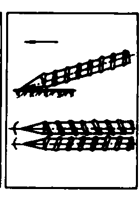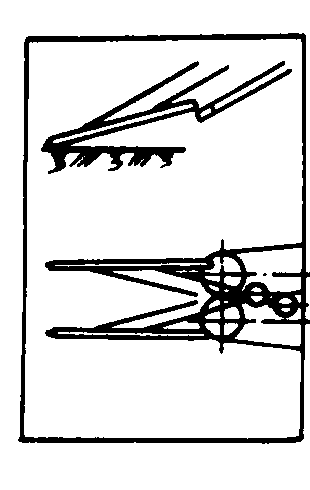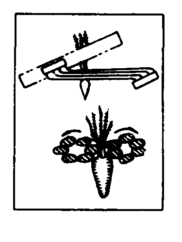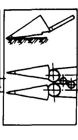 图1 胡萝卜收获机工作过程示意图 1.茎叶输送器;2.块根横向输送器;3.块根输送器;4.茎叶切除装置;5.夹持拔取胶带;6.扶茎器;7.挖掘铲 扶茎器 安装在机器前部,配置在作物行的两侧,作用是把茎叶扶起, 使其成束地喂入拔取器。扶茎器的工作质量在很大程度上决定着后继工序的作业优劣。扶茎器的类型如图2。图2(a)、(b)为固定式扶茎器, 它能很好地扶起横行倒伏的茎叶。但顺行倒伏的茎叶则需用(c)、(d)、(e)所示的旋转式扶茎器,以便沿地面梳刷茎叶, 并将其提到所需高度, 送向拔取器。