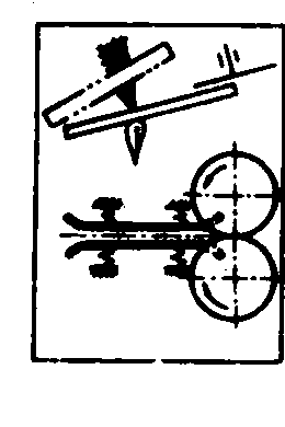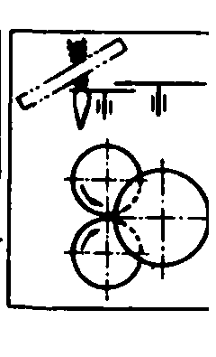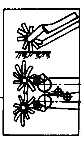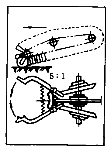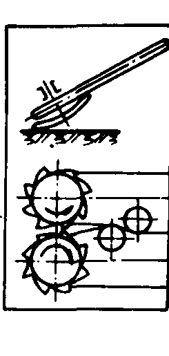 图3 拔取器类型简图 夹式拔取器 由许多夹子固定在链上而成。在链子前进方向最前端开始接触块根茎叶前, 夹子上端进入控制圆盘狭窄处, 将夹子张开[图3(b)], 待接触块根茎叶, 夹子上端脱离控制圆盘后, 夹子靠本身弹簧作用夹紧, 即夹住块根茎叶。夹式拔取器对生长较弱的茎叶夹持得也较好。邻接行茎叶密集时, 此种机构因受下垂叶片相互交叉的影响, 而使拔取质量不能保证。 圆盘式拔取器 由两个与铅垂面成一定角度的圆盘或低压轮胎组成,特点是结构简单,但工作质量较差。 螺旋式拔取器 工作时与地面倾斜一定角度, 且两个螺旋器安装在同一平面内互相平行, 能捡起躺在地上的茎叶, 并有将块根自土中拔起的功能。在切去茎叶前, 将块根茎叶拉紧, 使块根顶在拔取器下面排齐, 但它易发生堵塞, 故工作质量不能保证, 结构复杂。 组合式拔取器 由一直径较大的滚筒,和一回转胶带组成。胶带约贴紧滚筒圆周面1/4,工作时与地面成一定角度并作相对回转[图3(e)]。组合式拔取器主要特点是工作可靠,但外形尺寸大,不适用于多行机器。拔取器把块根自土壤中拔出的最佳条件是顺着块根轴线施加拔取力,因此时茎叶的强度最大,块根自土壤中拔出的力最小。 齐平器和茎叶分离机构 主要功用是使块根顶部的割茬高度整齐,并使茎叶分离。齐平器和茎叶收集机构类型如图4。