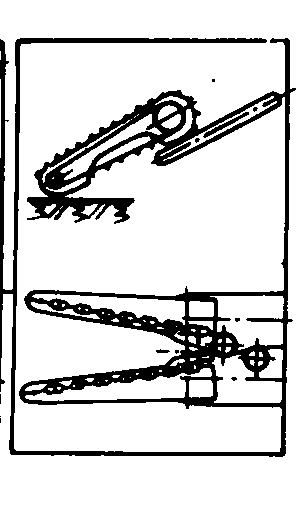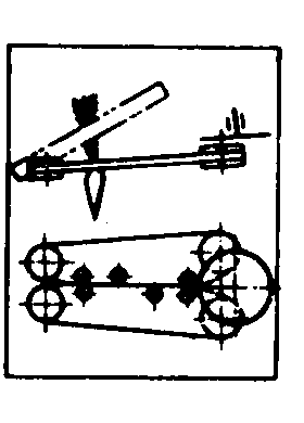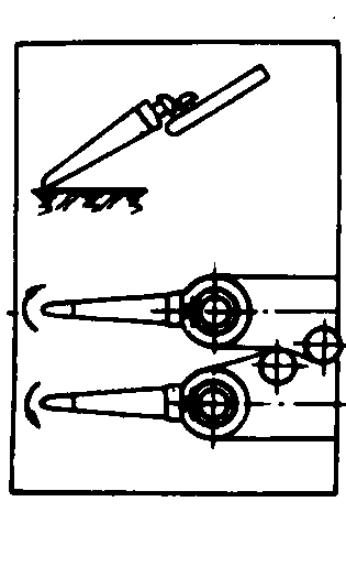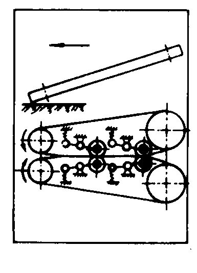 图2 扶茎器类型简图 拔取器 配置在扶茎器后面,将作物茎叶夹紧,之后,挖掘铲将块根挖掘,拔取器随即将块根自土壤中拔出。拔取器类型如图3。 带式拔取器 两条挠性回转带,靠张紧轮将两带彼此压紧。拔取器喂入口处的从动带轮或链轮直径要根据作物茎叶的情况来选择,要求喂入口尽可能靠近块根顶部,夹住茎叶,带轮前缘高度应保证在露出土壤的块根顶部上方移动时,不损伤块根。