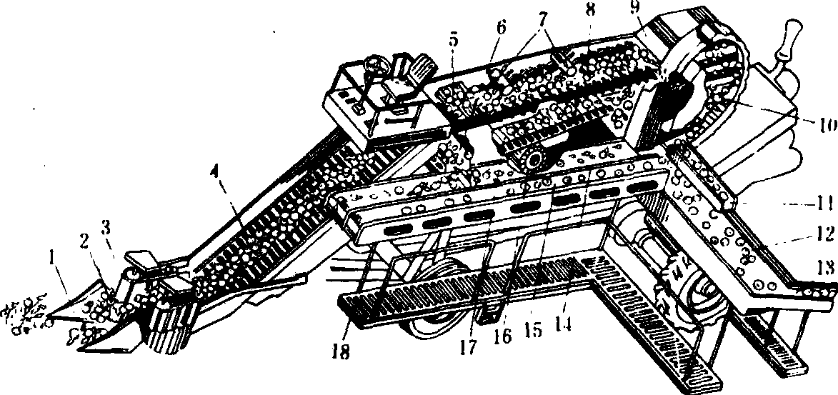 图7 番茄联合收获机 1.分禾器; 2.切割装置; 3.摘果输送器; 4.倾斜输送器; 5.过渡输送器; 6.分离输送器; 7.抖动滚筒; 8.键式果实分离器; 9.未成熟果实箱; 10.滚筒型升运器;11.未成熟果实输送器; 12.剔选台; 13.卸出输送器;14.果实分离输送台; 15、17.果实输送器; 16.风机; 18.工作平台 蔬菜收获机械vegetable harvesting machinery用来收获各种蔬菜的机械。已用于生产的机械有葱头收获机、甘蓝收获机、蕃茄收获机等。 |