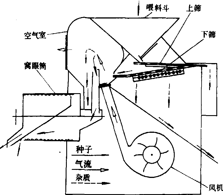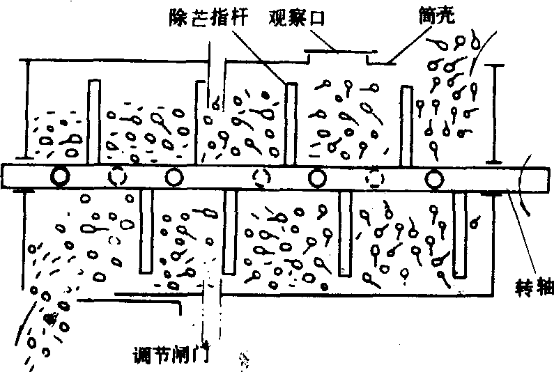 达到标准水分后,打开排料活门卸种。 除芒去毛机 有刷式、杆式和板式等多种类型。它们都是一个内装同心转轴的固定圆筒,筒内装待处理的种子。工作时,种子与运动部件以及种子颗粒之间相对研磨。不同机器的主要区别在于轴上的工作部件是按螺旋线排列的辐向指杆,还是板条,或者只是外侧面安装刷条的方形框架。图3为指杆式,外力驱动转轴在筒内旋转,工作部件对筒内种子进行挤压和搅拌,并带动种子沿圆筒内壁搓擦和相互研磨,以断芒毛。筒身有封闭式和金属编网式两种,后者使芒毛经网孔漏下,获得清洁种子,而前者将芒毛随种子一起排出,另行清理。有的机器在圆筒内壁布有凸棱或装有固定指杆,以增强打击搓擦。