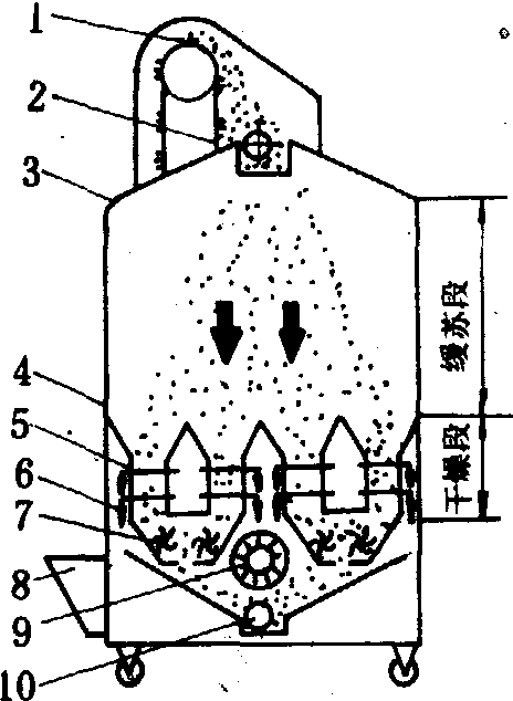 图1 5XT清选机示意图 烘干机械 蔬菜种子含水量超过安全贮藏水分时必需烘干。各种粮食烘干机械均可使用。一般采用低温薄层、大风量,以及合理的脱水速率。例如5HZ-3、2型种子烘干机(图2)的热风温度为50~70℃,种子层厚10厘米,对100公斤种子送入每秒钟0.4~0.6立方米的风量,脱水量控制在每小时平均0.6~1%之间,全机由燃烧炉、烘干箱(分干燥和缓苏两段)、吸气风机等组成。热空气被吸气风机引入烘干段的热风室并强制通过种子层使种子初步干燥。种子到达底部再经螺旋输送器和升运器送到烘干机顶部的均布螺旋输送器,被后者均匀推置在烘干箱的缓苏段内,在自重作用下再缓慢移动到干燥段,每次循环约1.5小时,这样多次循环