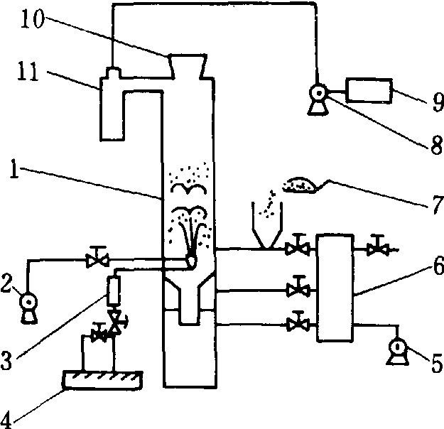 图 3 指杆式除芒去毛机示意图 造丸机 把种子裹以由农药、化肥、激素、吸水性和增氧性物料以及填充剂等构成的外壳,制成丸粒状种子的机械,可增加外形不规则种子的流动性,提高小粒种子的播种均匀度,改善种子苗期生长条件。造丸机按原理分有旋转型和飘浮型两种。旋转型又分滚筒式和锅式。滚筒式的筒中装有多孔喷水管和包衣物料送给器,种子从圆筒一端喂入,随圆筒一起旋转到另一端输出时即成包有物料的丸粒种子。多使用腰部呈外凸圆弧状的金属锅式造丸机,锅的最大腰径为35~55厘米,其中轴线与水平面构成15°~45°的倾角,以30~50转/分的速度旋转,一次加工40公斤左右的成品种子。滚出的丸粒种子粒径有差异,须经筛选,过大的捣碎包衣取出种子再加工,尺寸不足的倒入旋转锅继续加厚包层。滚动法的设备简单,但单粒率低,要求有熟练的操作技术,且工艺时间长。加工番茄、甜菜、胡萝卜等种子,一次约40~60分钟。飘浮型的主体工作部件是一个直立的造丸筒(图4),种子自顶部投入后,受筒中上升气流的作用,呈散粒悬浮状态,鼓风机供给压缩空气,由三根可以单独调节流量的管道送入造丸筒,这三根管道分别输送粉料,并随种子情况改变上升气流的速度。空气压缩机和液泵的出口管一起通向造丸筒中心,使粘合胶液雾化,促使种子表皮和粉末之间产生粘附力,种子在气流中的相互撞击和摩擦使物料粘结牢固,丸粒表面更光滑。未被种子粘附而由气流带走的粉末,经旋风分离器收集在布袋过滤器中,若造丸筒直径150毫米、高1 650毫米时,每批投入1.5~2公斤种子的造丸时间: 萝卜为7~10分钟,大白菜为6~8分钟。粉末与粘合胶液的供量比为2.6时,获得的丸粒均匀度最好。飘浮造丸后,种子包层的压碎强度比旋转造丸低40~60%。如在造丸筒内附加一个控制筒,使丸粒顺从不同路线上下运动,可增加压碎强度。