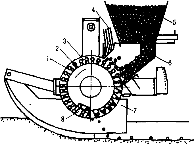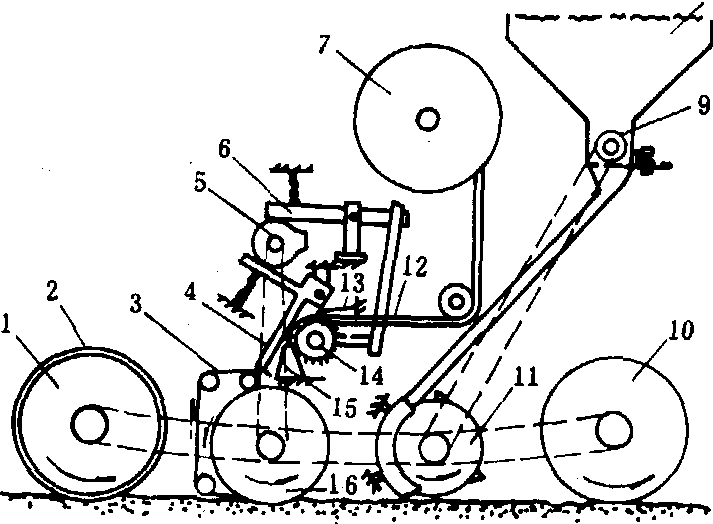 种子带播种机 专用于蔬菜种子带的播种。机上装放种子带卷,设开沟器和覆土器。工作时,种子带被连续拉开,铺放到开沟器开出的种沟内,并覆土。种子带播种机(图4)能将1.27厘米宽,种子间距1厘米的种子带切成小片播种,以减少种带的浪费,使种子与土壤更好地接触。工作时,随着凸轮转动一周,凸轮及棘轮爪驱动种子带传动链轮,使种子带准确地进给1厘米;凸轮驱动的种子带切割刀在种子带停止进给时切割种带一次,切下的种子带片被放入由导向轮表面的锥形凸起压出的小穴内,再由成穴器提供土壤改良物质加以覆盖。