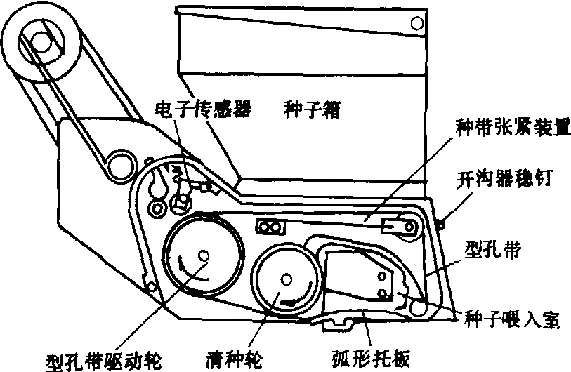 图1 型孔带式排种器 气力式蔬菜精密播种机 气力式排种器分气吸式和气吹式两种,适于播种大小不同的种子。气吸式排种器(图2)的排种盘一侧与真空室相通,另一侧与种子室相通,工作时,真空泵将负压传入排种器的真空室,使吸孔一侧产生负压。排种盘转动通过种子室,吸孔就吸附种子,排种盘继续转动经过锯齿形刮种板,吸孔上多余的种子被刮落,使每个吸孔只保留一粒种子,直至吸孔转过真空室进入投种区,吸力消失,种子靠自重落入播种沟。还有采用二次排种的气吸式排种器,吸盘完成吸种刮种之后,单粒种子投落到同步运转的分配轮叶片隔腔内,种子被分配轮加速后强制推送投种,加大了反向投种速度,减少播种机前进速度对种子的影响,提高株距的准确性。气吹式排种器(图3)具有漏斗形的型孔,工作时,排种轮经喂入室充种后,型孔携带种子向上转动到吹嘴处,吹嘴的压力气流将型孔内的多余种子吹回喂种室,只留一粒种子压附在型孔的底部,随排种轮的转动到达下方投种口,由推种板将型孔内的种子推出投种。