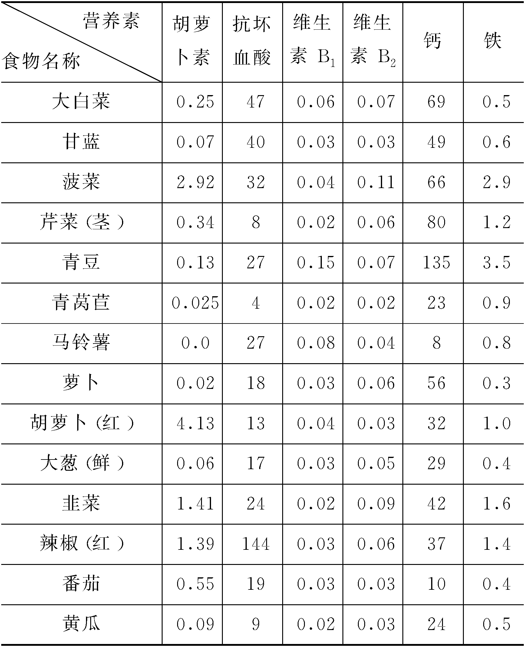 中国较为广泛栽培的蔬菜约60种。100g常见蔬菜维生素及矿物质含量见下表(单位:mg):