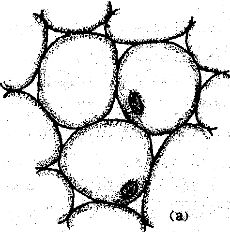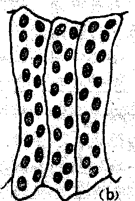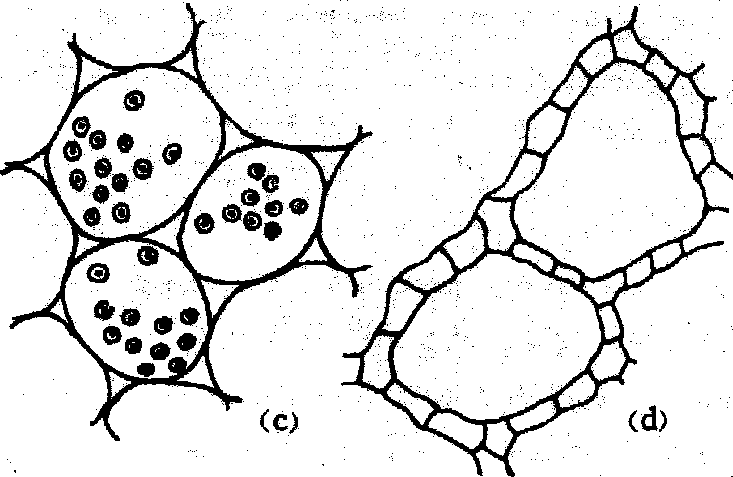 此外,有些薄壁细胞具有内突生长的细胞壁,增大了质膜的表面积,并含有丰富的细胞器和胞同连丝,有行使短途运输的功能,特称为传递细胞。传递细胞广泛分布于植物体内,如蜜腺、盐腺、子叶表皮、胚柄、胚乳、维管薄壁组织、花柱道等均有传递细胞的存在。 薄壁组织即“基本组织”。 薄壁组织parenchyma由生活的薄壁细胞所组成的一类基本组织。薄壁组织在植物体内分布广,所占比例大。它们的细胞多近于等径,液泡大,具细胞间隙,细胞壁一般仅有初生壁,由纤维素构成;但也有的薄壁组织细胞呈星芒状或臂状,细胞壁也可作不同程度的次生木质化加厚,如次生木质部薄壁细胞和少数髓中的薄壁细胞。薄壁组织分化程度低,有较大的可塑性和潜在的分裂能力,在一定的条件下可向其他成熟组织分化,或经过脱分化而再生。组织培养中,可用酶或机械方法除去薄壁组织细胞壁以获得生活原生质体,通过培养而形成新细胞壁,或经细胞分裂形成愈伤组织,再生新植株,为体细胞杂交提供条件。根据薄壁组织的主要生理功能不同,通常分为同化组织、贮藏组织、贮水组织、通气组织、吸收组织等。此外,还有细胞壁具内突生长的传递细胞,它们也有薄壁组织细胞的特点。 |