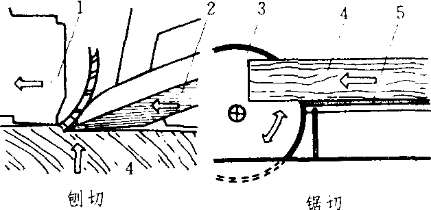 薄木加工方式 1.压梁 2. 刨刀 3.锯片 4. 木块 5. 送材车 |