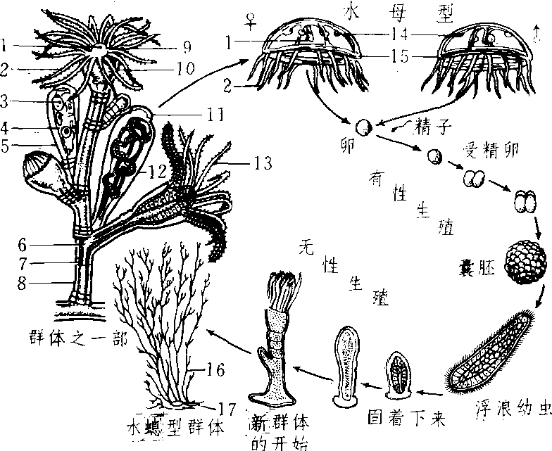 薮枝虫生活史 1.口 2. 触手 3 . 水母芽 4. 子茎 5. 生殖鞘 6. 消化循环腔 7. 共肉 8. 围鞘 9. 垂唇 10. 水螅鞘 11. 生殖体 12. 芽体 13.水螅体 14. 生殖腺 15. 缘膜 16. 螅茎 17. 螅根 |