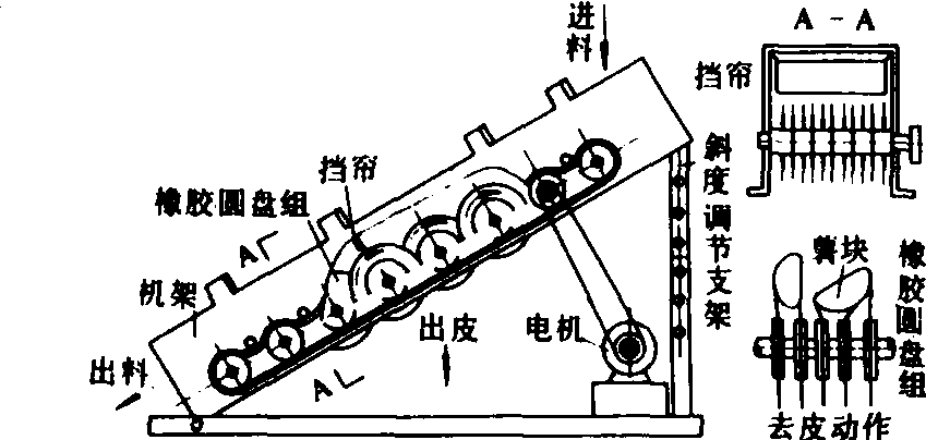 图1 干式去皮机 切碎机 可将薯块切成片状、条状、块状、鱼鳞等几何形状。主要有垂直圆盘式、水平圆盘式、离心式和滚筒式等机型。其中离心式切碎机应用较多。它主要由喂入口、定刀片、回转叶片和机壳等部分组成。薯块随回转叶片运动,在离心力作用下,紧贴侧壁运动,被机壳内壁上的定刀片切成薄片。调节出料口间隙就可得到不同厚度的薯片。若在薯片出料口处增设纵向和横向刀片的切碎滚筒,将排出的薯片再进行纵向和横向切割,便可获得薯丁或薯条。 薯类淀粉加工成套设备 有小型薯类淀粉加工成套设备和大型薯类淀粉加工成套设备两大类。 小型薯类淀粉加工成套设备 常用的有两种类型。一种的结构如图2,主要由锉磨辊和分离筛组成。
